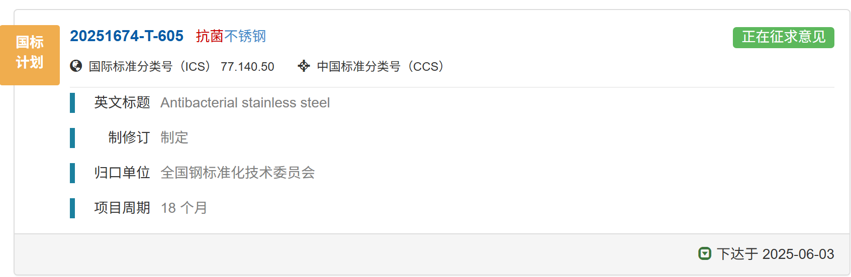 國家標(biāo)準(zhǔn)《抗菌不銹鋼》正在征求意見中,歡迎報名成為參編單位并提出修改意見和建議。01 國家標(biāo)準(zhǔn)計劃《抗菌不銹鋼》已下達國家標(biāo)準(zhǔn)計劃《